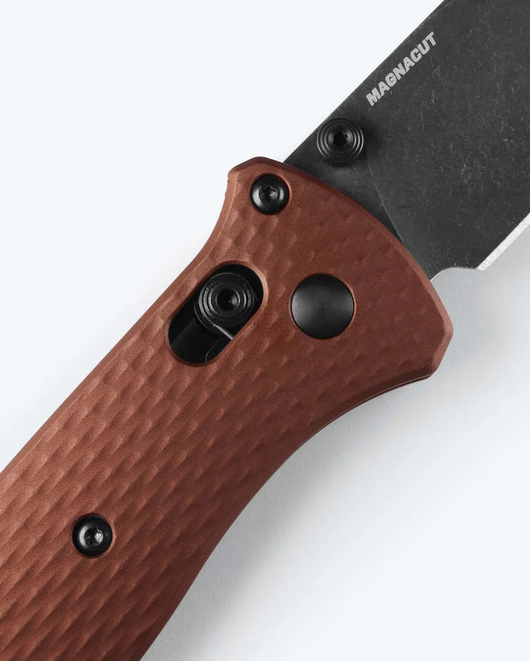 The Bailout® family of folders has long been revered for its combination of no-holds-barred strength and slim, ultralight build, making it an impressive tool on the trail or on the job. The new 537BK-07 Bailout® introduces CPM-MagnaCut stainless super steel with enhanced corrosion-resistance in a DLC Battlewash finish. Together with lightweight, diamond-textured Burnt Copper anodized aluminum handle scales and black oxide hardware, this ruggedized ultralight is ready for the next adventure.